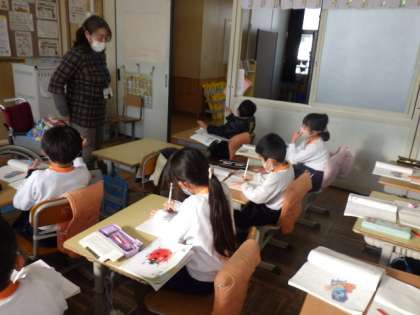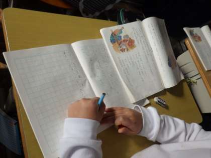 2年生の国語では「かさこじぞう」を学習しています。1/18の学習では、もちを買えずに帰宅したおじいさんと、家で待っていたおばあさんが、一緒に餅つきのまねごとをしている時の二人の気持ちを考えました。「おもちなしかあ。でも楽しいなあ」「本当のもちは無理だけど、もちつきのまねをして楽しもう」など、登場人物の気持ちになって書いていました。