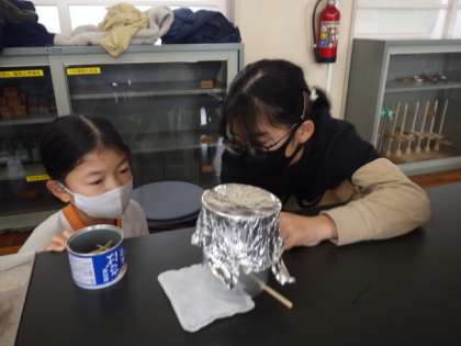 4年生の理科では、「もののあたたまりかた」を学習しています。1/23の学習では、マッチで線香に火をつけ、閉じ込めた煙を含んだ空気をあたため、空気の動き方を観察しました。初めて経験に、児童は恐る恐るマッチをすりました。「あ、ついた!」の声があがりました。線香の煙がでてくると、顔を近づけて空気の動きを観察しました。