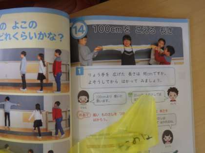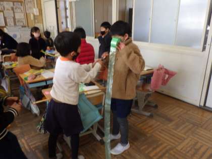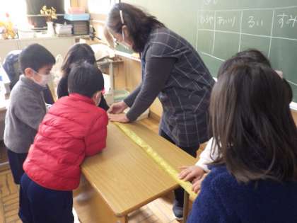 2年生の算数では、「1mをこえる長さ」について学習しています。1/26の学習では、児童が図らずに感覚で1mの長さのテープを測りとり、だれが1番1mに近いかを競い合いました。なんと、ぴったり1mを測りとった児童がいて、クラスみんなで大きな拍手をしました。