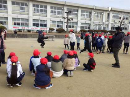 1月中旬より、フレンド班(縦割り班)で長縄練習を積んできました。2/3(金)の2時間目に、体育委員が中心となって「なわとび集会」を行いました。フレンド班ごとに、3分間でどれだけ跳べるかを競うものです。主に6年生が縄をまわし、下級生がリズムよく跳んでいきました。苦手な子には、まわりの子が縄に入るタイミングを教えていました。順番待ちの班は、回数を数え、応援をしていました。優勝は4A班、128回跳びました。どの班も、日ごろの練習の成果を十分に発揮していました。