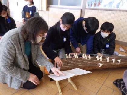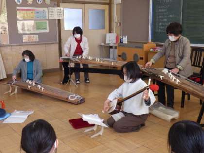 5年生の音楽では、日本の伝統音楽について学習します。2/8(水)の3〜4時間目に、地域の琴の講師さんが来校し、5年生に琴の弾き方を教えてくださいました。簡単な説明の後、さっそく数字で書いてある楽譜を見ながら、「さくらさくら」を弾きました。ゆっくりながら曲になると、自分で伝統的な音楽を奏でられたことを、喜んでいました。最後に、講師のみなさんが、「春の海」を、琴と三味線で披露してくださいました。