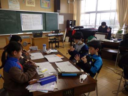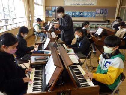 5年生の音楽では、「キリマンジャロ」の合奏練習に取り組みました。使用する楽器は、リコーダー、オルガン、大太鼓、小太鼓、シンバル、タンバリンです。それぞれパートで練習した後、最後に全体で合わせました。