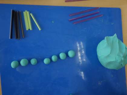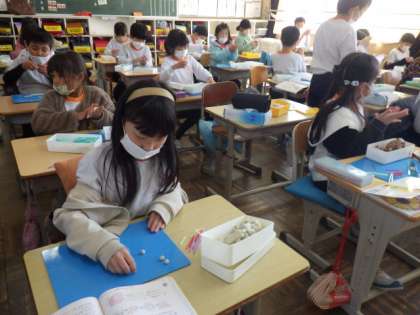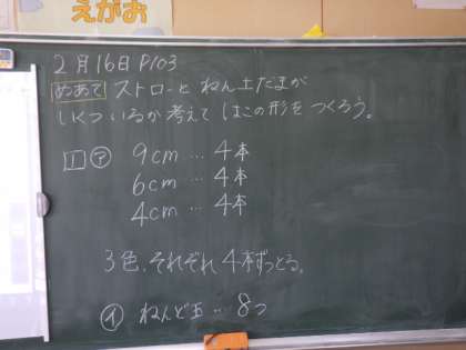 2年生の算数では、「はこの形」を学習しています。2/16の授業では、「(四角い)はこの形を作るのに、ストロー(辺)とねん土玉(頂点)がいくついるか」を考えました。自分でねん土玉をつくり、ストローをつなげてはこを作り、いくつ必要かを考えました。