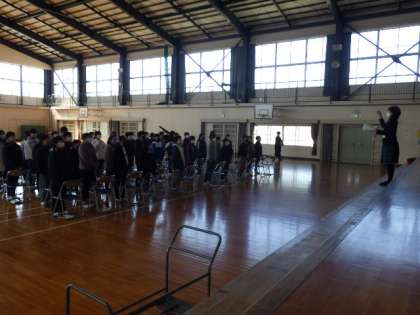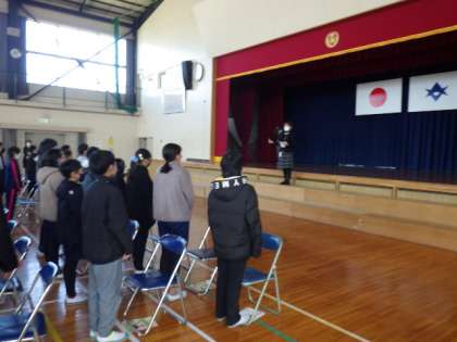 6年生は、3/20の卒業式で、5年生とともに校歌を歌う予定です。2/21の音楽の授業では、6年生全員が体育館に集まり、校長先生、音楽担当教師とともに、校歌の練習をしました。「ここは、クレッシェンドの記号だから、少しずつ大きくするよ」などの指導に合わせて、歌声を大きくしていきました。高音がとても澄んでいて、美しい歌声でした。