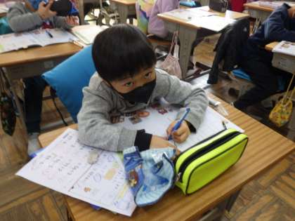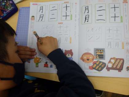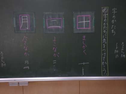1年生の国語・書写では、字の形に気を付けて漢字を書く練習をしました。「十…ましかく」「二…よこなが」「月…たてなが」と、おおよその形を学んでから書きました。ゆっくりゆっくり、ていねいに書いていました。