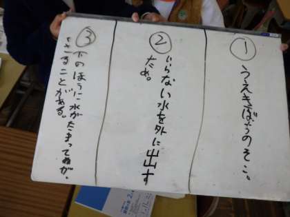 2年生の国語では、「あなのやくわり」を学習しています。2/27の授業では、教科書の本文から、「植木鉢の穴の場所」「植木鉢に穴は何のためにあいているか」「植木鉢の穴がないとどうなるか」を読み取り、班で話し合ってホワイトボードにまとめ、全員で確認しました。