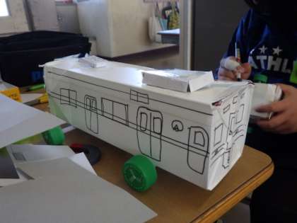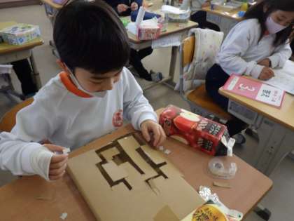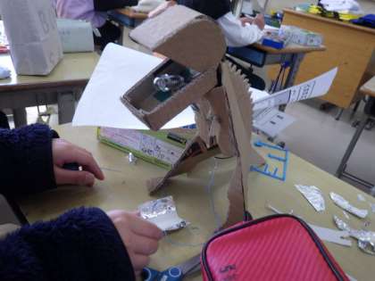 3年生の理科では、ここまで磁石や電気について学んできました。そのまとめとして、磁石や電気の性質を使ったおもちゃを作っています。2/27の授業では、磁石の性質を使った迷路や、電気が点灯する恐竜など、ユニークな作品を作っていました。