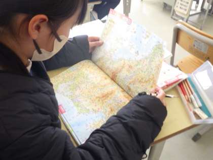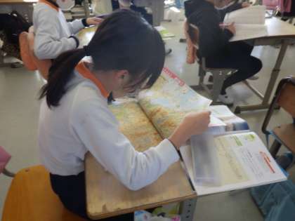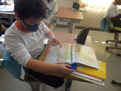 5年生の社会科の授業では、地図帳を開き、三宅島を探しました。児童は、「え、ここも東京都なの?」と驚いていました。地図をじっくり見る、貴重な機会となりました。