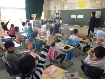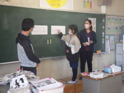2/28の3年生外国語活動では、アルファベットを学習していました。ALTの先生が発音したアルファベットW、Bなどを、黒板に貼られた4線上に書いていました。