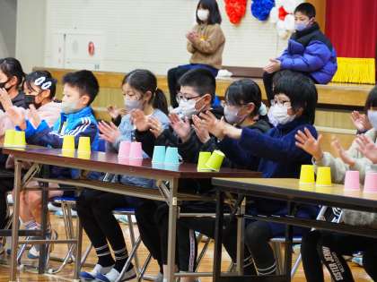 1年生は、「サチアレ」という歌を歌いながらのダンス。2年生は、6年生の活躍を歌詞に込めた歌と楽器演奏。3年生は、卒業生が過去の学芸会で演じた劇をミックスして再構成した劇。4年生は、ボディーパーカッションと紙コップを机の上で操作する「カップス」。5年生は裏方に徹し、司会、照明、暗幕、誘導、盛り上げなど、すべてを運営しました。