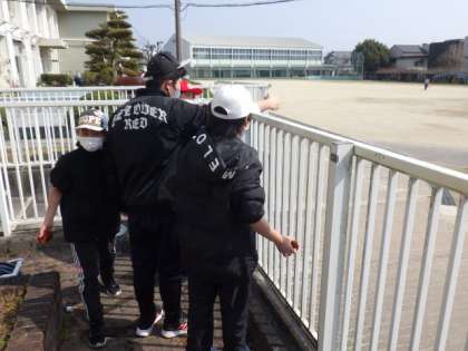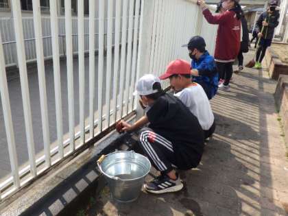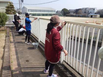 暖かな春の日の中で、6年生清掃班は学校のフェンスを磨きました。コケやごみがついたフェンスをたわしで磨くと、真っ白なフェンスによみがえりました。6年生の学校への感謝の気持ちが、あらわれていました。