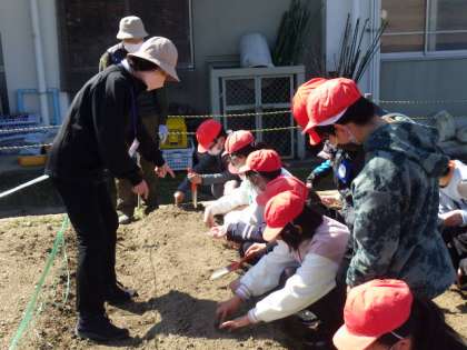 5年生は、6年生になったら理科でジャガイモを教材に使って勉強をします。3/15は、地域の野菜名人さんから、種イモの植え方を教わり、みんなで学校の畑に植えました。6年生になった5〜6月頃、生い茂った葉っぱや茎を使って勉強をします。