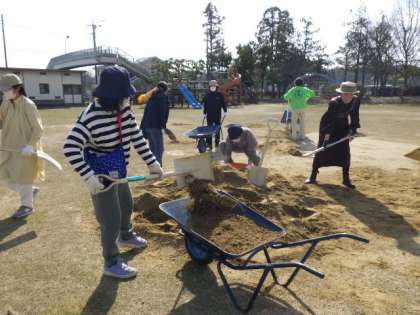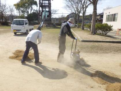運動場の西側が、大きくくぼんでしまったため、保護者・地域の方16人と教職員で補修作業をしました。トラック2杯分の砂を窪地にまきました。今回は、地域の方が転圧機を貸してくださり、地面を固めました。
