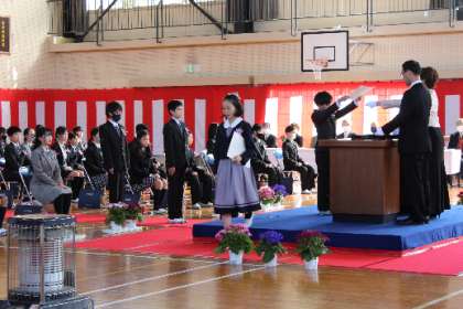 3/20(月)あたたかな春の日差しの中、伊保小学校卒業証書授与式が行われ、卒業生46名に卒業証書が手渡されました。5年生の別れの言葉では、卒業生へのたくさんの「ありがとう」の気持ちが入った言葉が贈られました。卒業生は、保護者、在校生、地域の方、教職員に向けて、感謝の気持ちがつまった別れの言葉を述べました。式の最後には、卒業生、在校生、保護者、地域の方、教職員の校歌が体育館いっぱいに響き渡り、46名は立派に巣立っていきました。