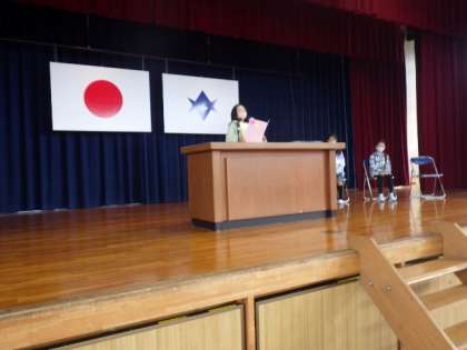 1、3、5年生の学年代表が、1年間の振り返りと次年度の抱負をスピーチしました。1年生代表は「ならばせかかりをがんばったこと」、3年生代表は「学級内の班長やリーダーとしてがんばったこと」、5年生は「委員会でがんばったこと」などを発表しました。