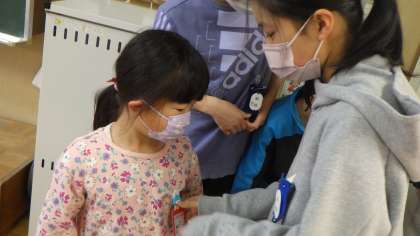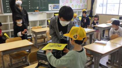 1年生は学校に到着すると、かばんの中の用具を机の中に入れたり、提出物を出したり、名札をつけたりします。やることがたくさんあるので、6年生が1年生の活動を手伝います。1年生は、ところどころを6年生に手伝ってもらいながら、朝の準備をしています。1年生はとてもうれしそうです。