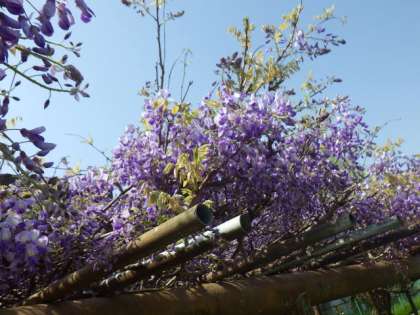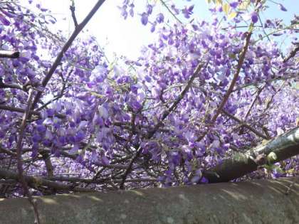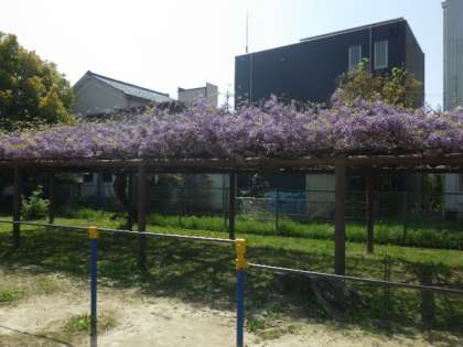 伊保小学校の運動場南側に、藤棚があります。伊保小学校の校歌にも「♩幾年ふりし ふじかづら」という歌詞があります。最近の暖かさで、藤の花が咲き始めました。ほんのりよい香りが漂っています。
