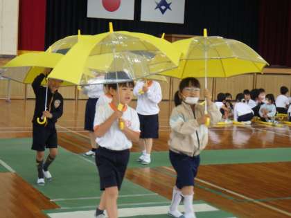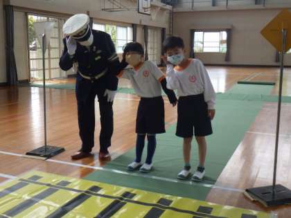 4/19に交通指導員さん5人が来校し、1年生対象に交通安全教室を行いました。体育館にミニ信号機や横断歩道、踏切が設置され、児童は交通指導員さんから、安全な横断歩道や踏切の渡り方を教えてもらいました。また、傘を高く上げて横断歩道を渡ると、ドライバーさんにもよくわかることも、教えてもらいました。