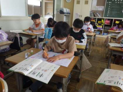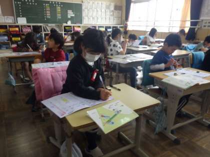 2年生の書写では書き順に気を付けて、漢字を書きました。書き順に気を付けるとどんなよいことがあるか考えると、児童は「バランスがとれる」「きれいに書ける」などと意見がでました。