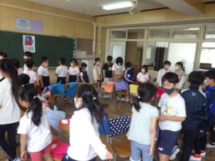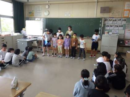 まず最初に、各教室で、6年生が作った、各フレンド班のマスコットキャラクターの紹介がありました。続いて、1年生がはきはきと自己紹介をしました。また、2〜6年生も自己紹介をしました。最後に、6年生が考えたゲームを行いました。フルーツバスケットやいす取りゲーム、じゃんけんジェンガや新聞じゃんけんなどを行いました。各フレンド班は、みんな仲良しになり、とてもよいスタートが切れました。