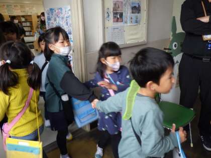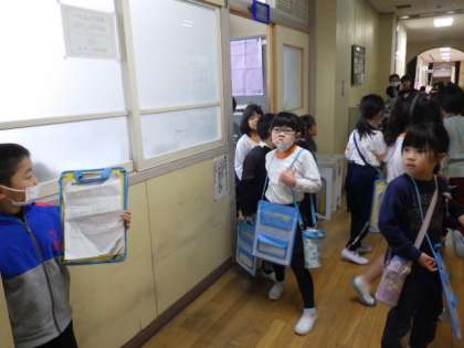 4/25(火)、1・2年生は生活科の学習の中で、学校探検を行いました。2年生が計画し、1・2年生の10グループで活動しました。学校の様々な場所に掲示してある「ひらがな」をスタンプラリー形式で集めながら、探検を楽しみました。