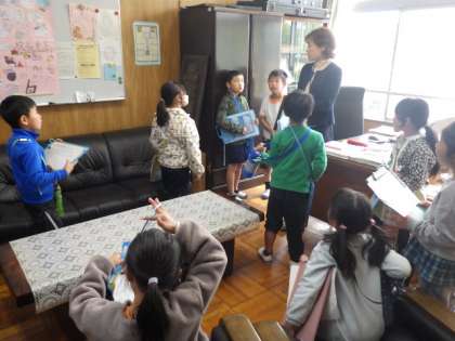 2年生は1年生の手を引きながら、「ここは図書室だよ」などと案内をしていました。校長室では、校長先生にインタビューをしました。