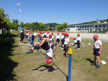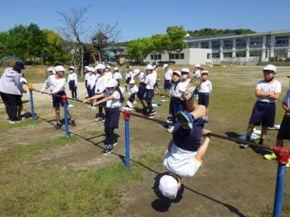 3年生の体育では、鉄棒の逆上がりに挑戦中です。担任の先生からコツを聞いて、逆上がりに挑戦しました。すでにできる子は、挑戦中の子に教えました。担任の先生は、補助ベルトを使って、逆上がりのコツをつかませていました。