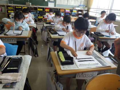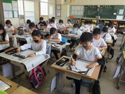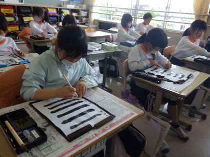 書写の授業では、3年生から毛筆が始まります。3年生は4月半ばに習字道具の準備の仕方と片付け方を学び、4/28(金)は、いよいよ初めて毛筆で書いていました。初めて書く字は、「一」です。最初と最後に気を付けて、何本も何本も一を書きました。