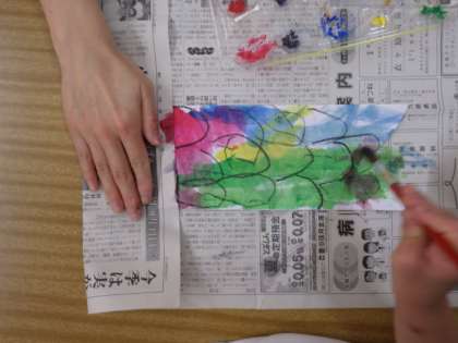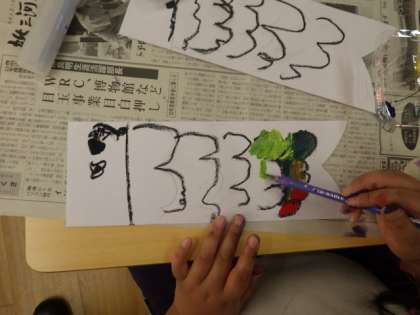 特別支援学級1・2年生の学活では、こいのぼりづくりをしました。画用紙のこいのぼりに、クレヨンで目やうろこを書き、水彩絵の具と筆を使って色を塗りました。青空に映える、きれいなこいのぼりができました。