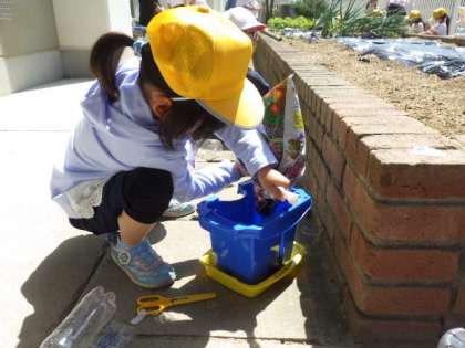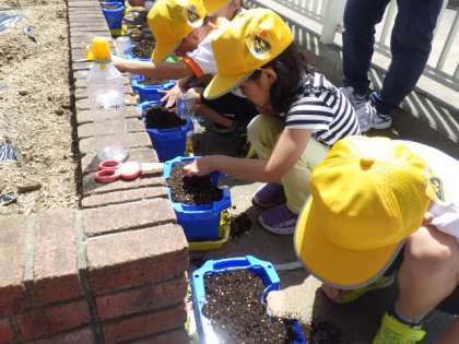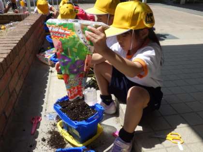 1年生の生活科では、アサガオの種まきをしました。最初に先生からの説明をよく聞いて、植木鉢に土を入れ、人差し指で穴をあけて、種を入れて、優しく土をかけました。肥料をまき、水をかけながら、「早く芽が出てね〜」と声をかけていました。