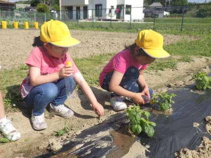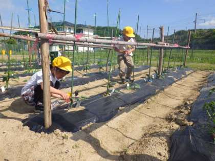 1・2年生は、登校して朝の支度を整えると、校舎裏の畑へ出かけます。5/1(月)に植えた野菜の苗のお世話をしています。苗ひとつひとつに丁寧に水やりをして、「早く大きくなってね」と言葉をかけています。