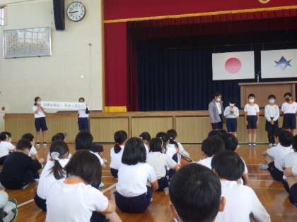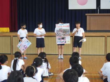 さらに、図書委員会、給食委員会、生活委員会から発表や連絡がありました。図書委員会の発表では、図書室に掲示してある「小学図書館ニュース」の内容をわかりやすく全校に伝えました。今回は、「リサイクル」と「ネットのこわさ」でした。給食委員会は、来週行う「食のマナー週間」の連絡でした。生活委員会からは、今月の生活目標が伝えられました。