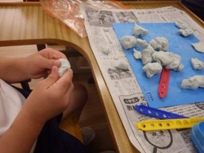 1・2年生特別支援学級の生活単元では、粘土を使って大好きなキャラクターを作りました。粘土をちぎったり、くっつけたり、ヘラでへこませたりして、キャラクターの顔を作りました。