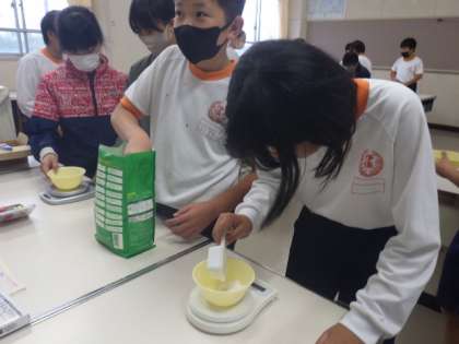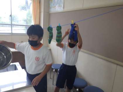 6年生の家庭科では、洗濯の仕方を学習しています。5/19(金)の授業では、児童が家から持ってきた靴下を洗いました。使う水に対して適正の量の洗剤をはかり、溶かしました。泡立たせた洗剤液の中で、靴下をもみ洗いしました。すすいで、絞って、室内に干しました。自分できれいにした靴下を見て、6年生はすがすがしい表情でした。