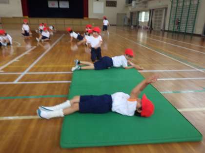 1年生の体育では、マット運動を行っています。6/1の授業では、児童はマットの上で、クマ、フラミンゴ、アザラシ、カエルなど、様々な動物の真似をして、楽しみました。