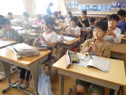 4年生の音楽では、リコーダーを練習しています。6/1の授業では、「歌のにじ」という曲をリコーダーで演奏しました。音楽担当の先生の伴奏に合わせて、きれいなリコーダー演奏となりました。