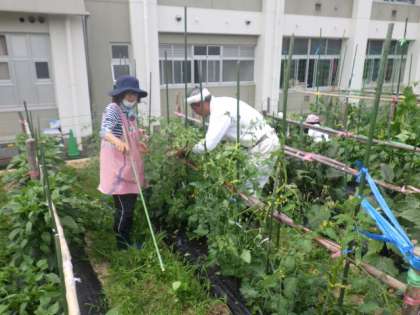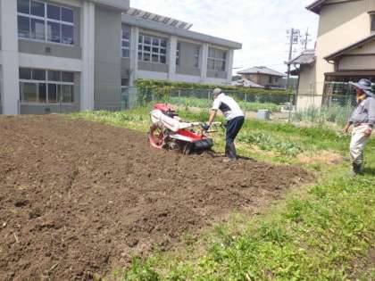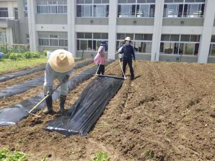 草だらけの畑を耕運機で耕し、石灰と肥料を混ぜて畝をつくりました。畝にはマルチシートをかけました。また、5月初旬に植えた野菜がぐんぐんと生長したため、茎を支柱に結わいてくださいました。6/9(金)に、1・2年生がサツマイモの苗を植える予定です。
