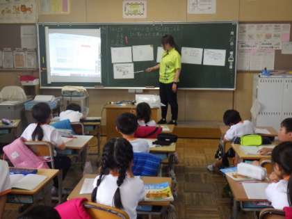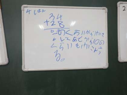 2年生の算数では、繰り上がりのある足し算の筆算を学習しています。6/5(月)の授業では、グループごとに34+28の筆算のやり方について考え、ホワイトボードに書いて発表しました。
