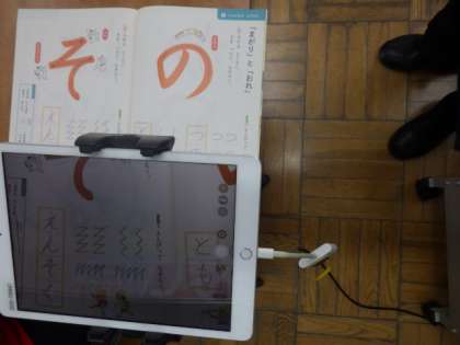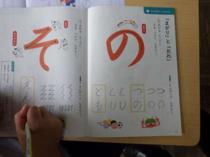 1年生の書写では、「曲がり」「折れ」に気を付けてひらがなの練習をしました。最初に丸い形やジグザグ線や折れ線をはみ出さないようになぞりました。姿勢や鉛筆の持ち方にも気を付けて書きました。その後、「の」「そ」を丁寧に書きました。