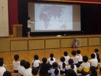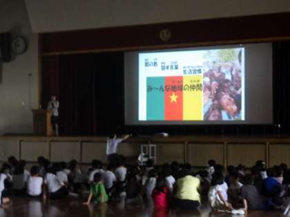 校長先生からは、校長先生が以前訪問した国・カメルーンについて、写真を見ながらお話を聞きました。日本〜カメルーンまで飛行機で24時間かかると聞き、児童はとても驚きました。カメルーンの学校では、校庭にパンやさんやお菓子屋さん、文房具屋さんがお店を開くことを聞き、児童は「いいなあ〜」を連発していました。カメルーンの子どもたちの勉強風景を見て、カメルーンの子どもたちも学校が大好きで、がんばっていることが伝わってきました。「肌の色、言葉、生活習慣は違っても、み〜んな地球の仲間だよ」という校長先生の言葉に、児童はうなずいていました。