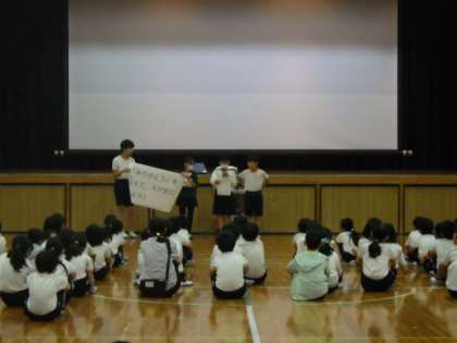 生活委員会からは、今月の目標「ありがとうを伝えて、笑顔にしよう」が全校児童に発表されました。