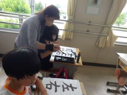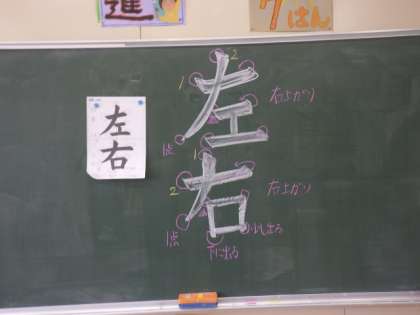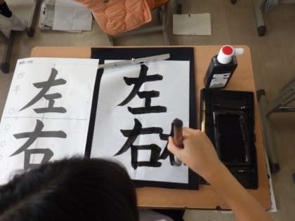 6/8、4年生は書写で「左右」という文字を練習しました。最初に担任から気を付けるポイントを聞き、児童はそれをお手本に書き込んで練習しました。特に、横画を右上がりになるように書きました。