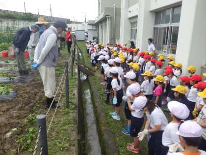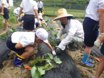 最初に苗の植え方を野菜名人さんから教わって、2年生と1年生がペアとなって畑に入りました。2年生は昨年の経験を生かして、「なえを、ななめにうえるんだよ」と、1年生に教えながら植えました。「おいしい焼き芋が食べられるかなあ」と、児童は秋の芋ほりを楽しみにしていました。