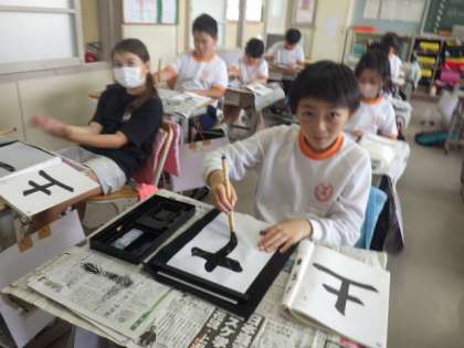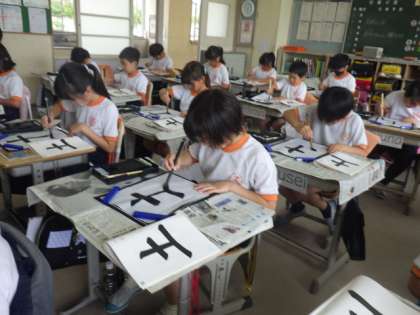 3年生の書写では、横画に続いて、たて画の書き方を学習しました。穂先を左上に向けることに注意して、ゆっくりと「土」を書きました。