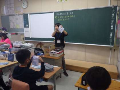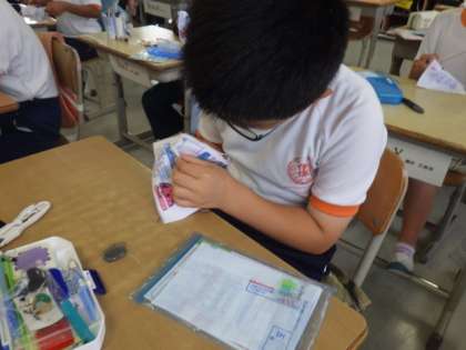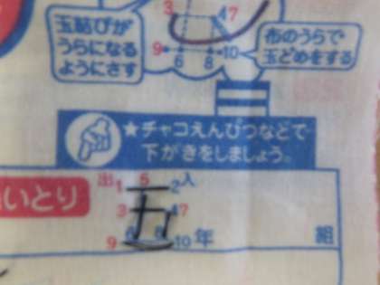 5年生の家庭科では、裁縫の基礎を学習しています。6/12の授業では、練習用の布に、玉結びと玉止めを使って、「五」という漢字を刺しゅうしたり、自分の名前をカタカナで刺しゅうしたりしました。