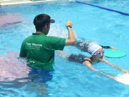 6年生は、ツバスコース(初級)、ハマチコース(中級)、ブリコース(上級)の3つのコースを設定して行っています。6/13の授業では、水慣れの後、学生コーチの指導で、だるま浮きやラッコ浮きを行いました。また、「腰かけキック」「壁つかみキック」「ビート板キック」など、キックの練習をしました。ブリコースはクロールの反復練習を行い、タイム計測をしました。