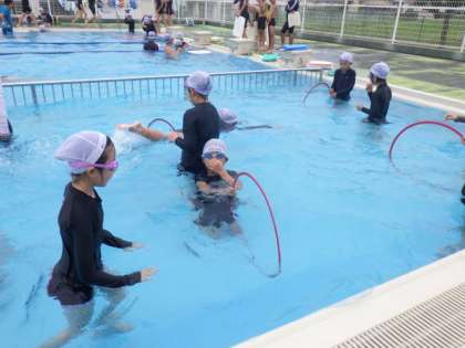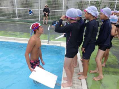 初級コースは輪くぐりをしたり、蹴伸びをしたりしました。中級コースは、バタ足の基礎を、学生コーチに教えていただきました。上級コースは、ビート板を使って深いプールでバタ足を繰り返し練習し、クロール練習に入っていました。
