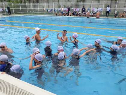 最初に水に慣れるために、学生コーチとともに「じゃんけん列車」を行い、最後には長い1列になりました。