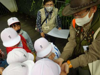 まず、児童は、自然観察の森のスタッフから、「草や葉のどこに、生きものが隠れているのか」をまとめたスライドを見て、学習しました。