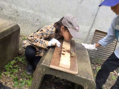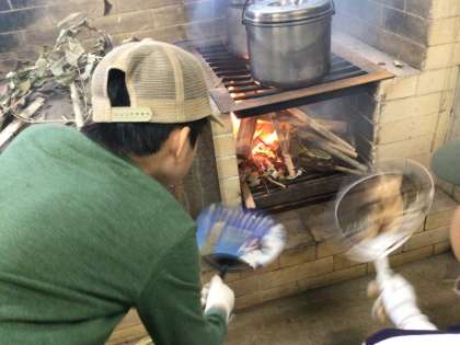 みんなで起こした火を薪に移して、大きな火にしました。湿度が高いという悪条件にもかかわらず、きれいに割れた薪とうちわのおかげで、あっという間に火がつきました。